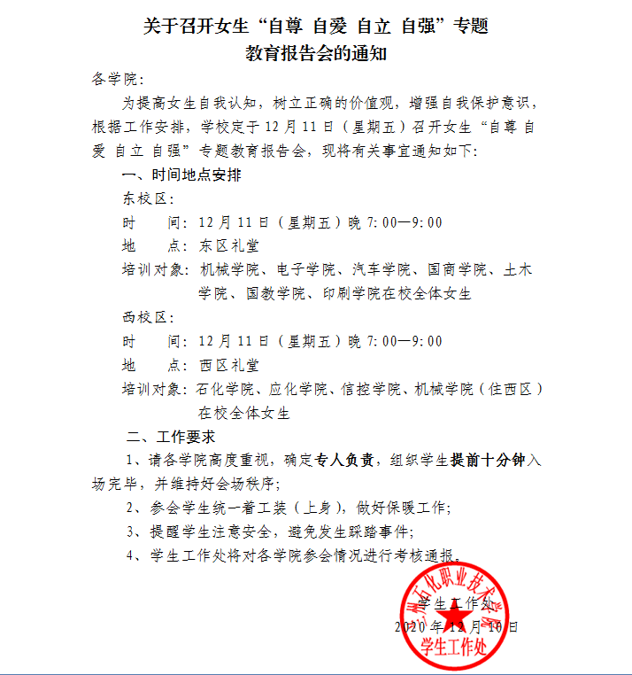 关于召开女生“自尊 自爱 自立 自强”专题教育报告会的通知