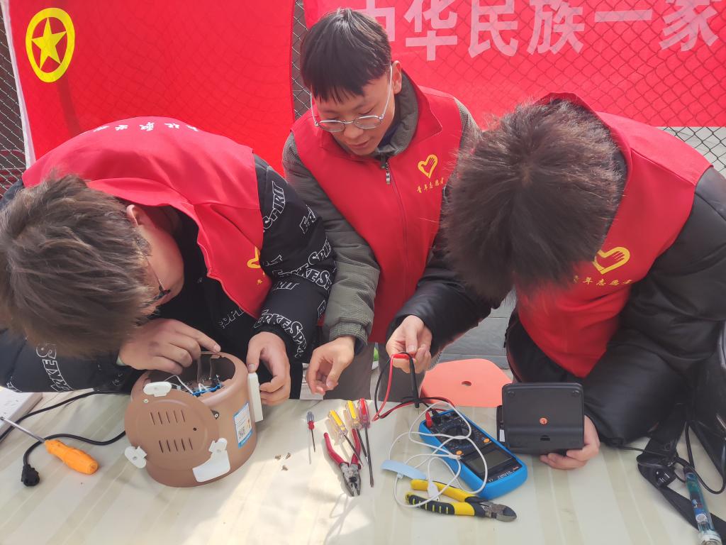 我院学子在到达目的地后,快速搭建了服务点,并与社区工作人员一同向附近居民开始宣传,在志愿者们的热情宣传下,闻讯而来的居民们陆陆续续从家中拿来收音机、学习机、台灯、热水器、豆浆机、热水壶、电磁炉等不能正常工作的家电。志愿者们首先对居民们拿来的家电进行问题登记,并且贴上标签,接着便开始仔细查找电器存在的问题,并且利用自己的专业优势和专业技能,将送来的电器进行认真检查,并竭尽全力维修,在维修过程中也耐心的向居民们解答了居民们所提出的问题,同时向村民普及了家用电器的维护及保养方法、传播了安全用电知识。